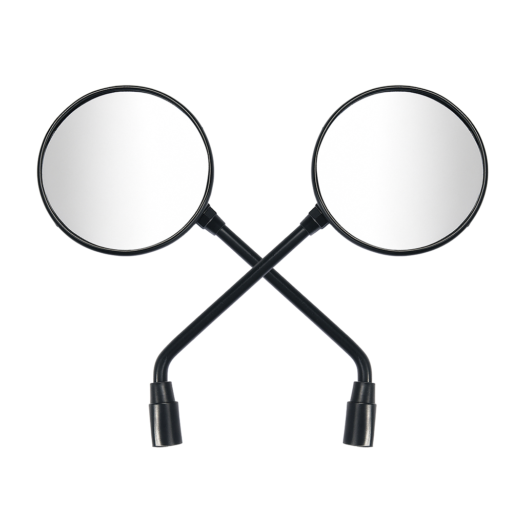Round motorcycle side mirrors with a matte black finish and extended angled stems for enhanced rear visibility and a timeless design.