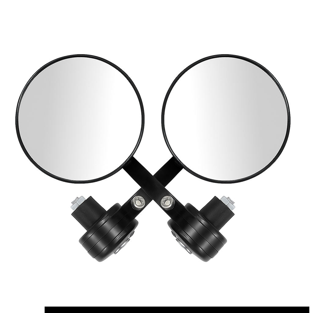 Round bar-end motorcycle mirrors with a bold black metal frame and solid mounts for a rugged, classic appearance.